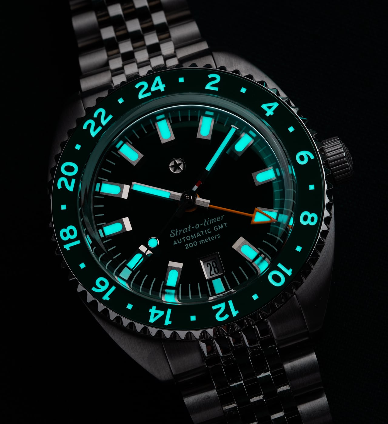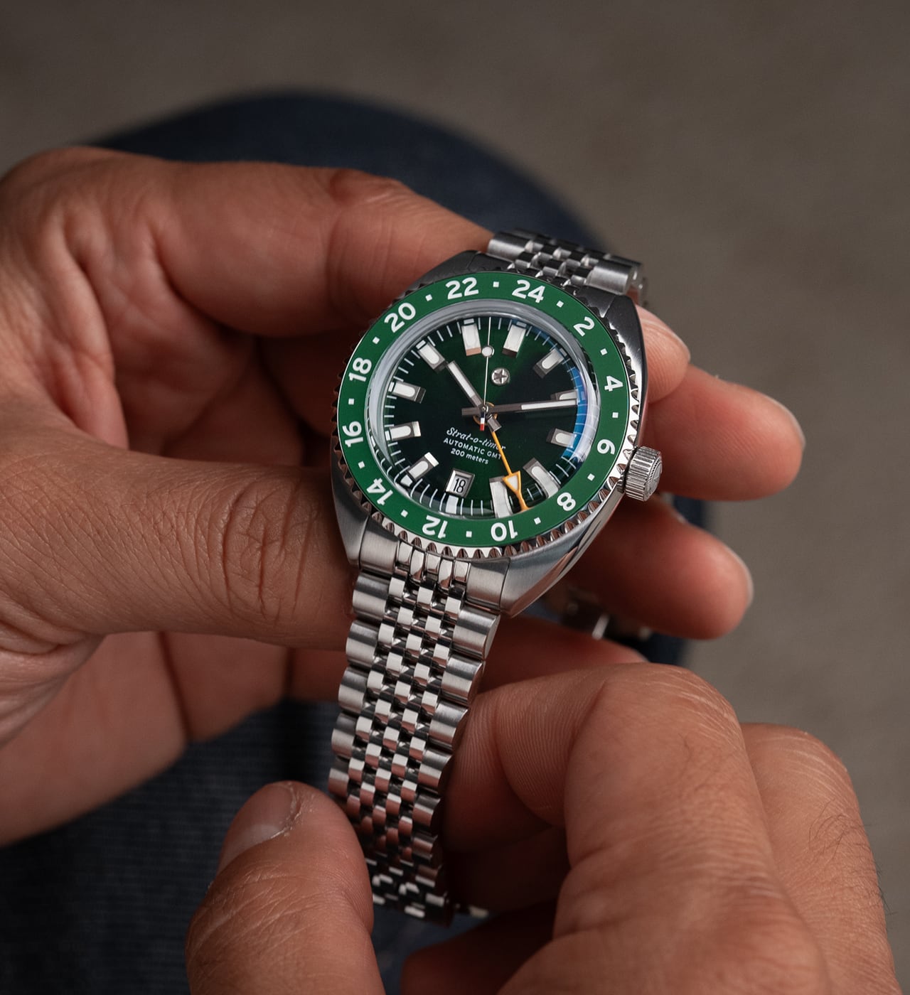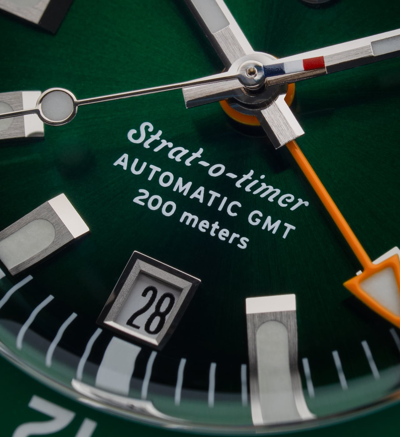 The mechanical, self-winding Miyota 9075 movement allows for accurately tracking two different timezones simultaneously. The traveler GMT functionality grants the ability to adjust the local time via the crown without affecting the 24 hour hand or stopping the watch. Every movement is regulated in-house to maintain an accuracy tolerance of +/-5 seconds per day.