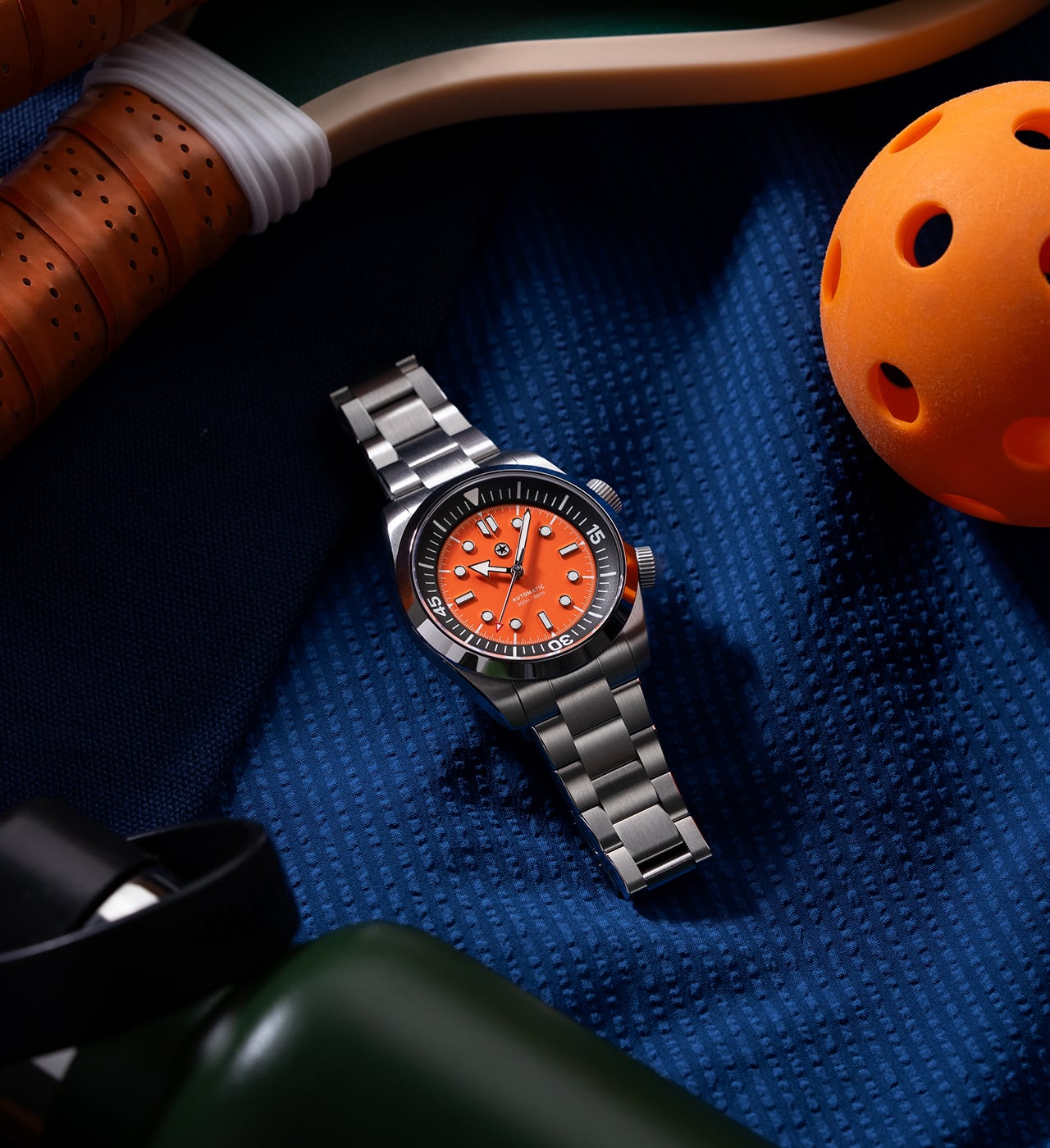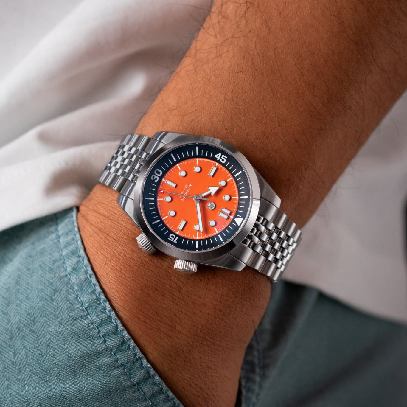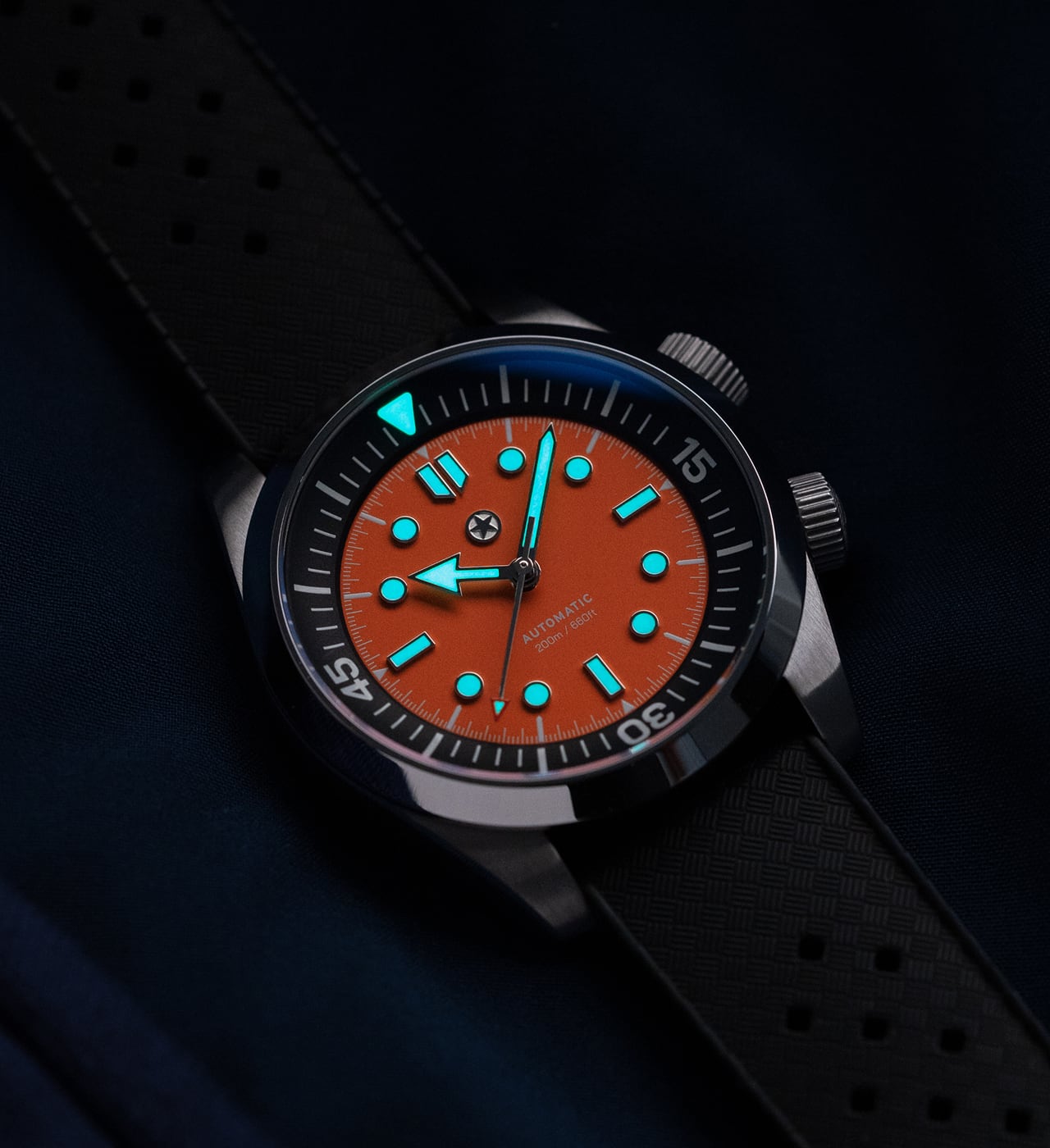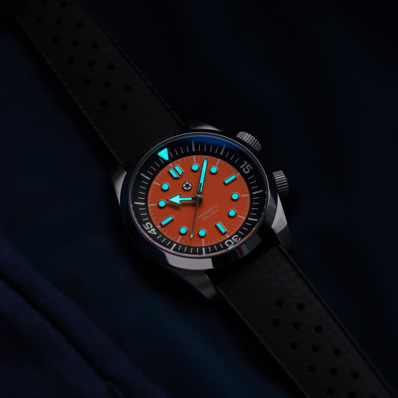 To keep legibility high, Grade-A Swiss Super-LumiNova® BGW9 luminous material fills the deep reservoir of each hour marker and is precisely applied to the hands. It emits a crisp blue glow in darkness, but maintains a clean white appearance in full daylight.