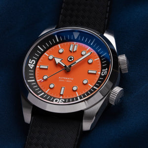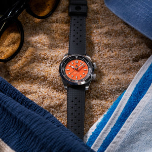 The Palmera Skin Diver is the first watch to be released under our new Born & Raised founder release program. Inside the watch is the La-Joux-Perret G101 movement that features a 68 hour power reserve and is regulated in-house to +/- 5 seconds per day. The internal rotating bezel is operated via the second crown. The dial and handset both feature Grade A BGW9 to ensure long lasting glow in low light environments. With a vision of becoming a legacy brand in our home state of Texas, the Palmera Skin Diver is assembled, and the movement regulated, in the United States.