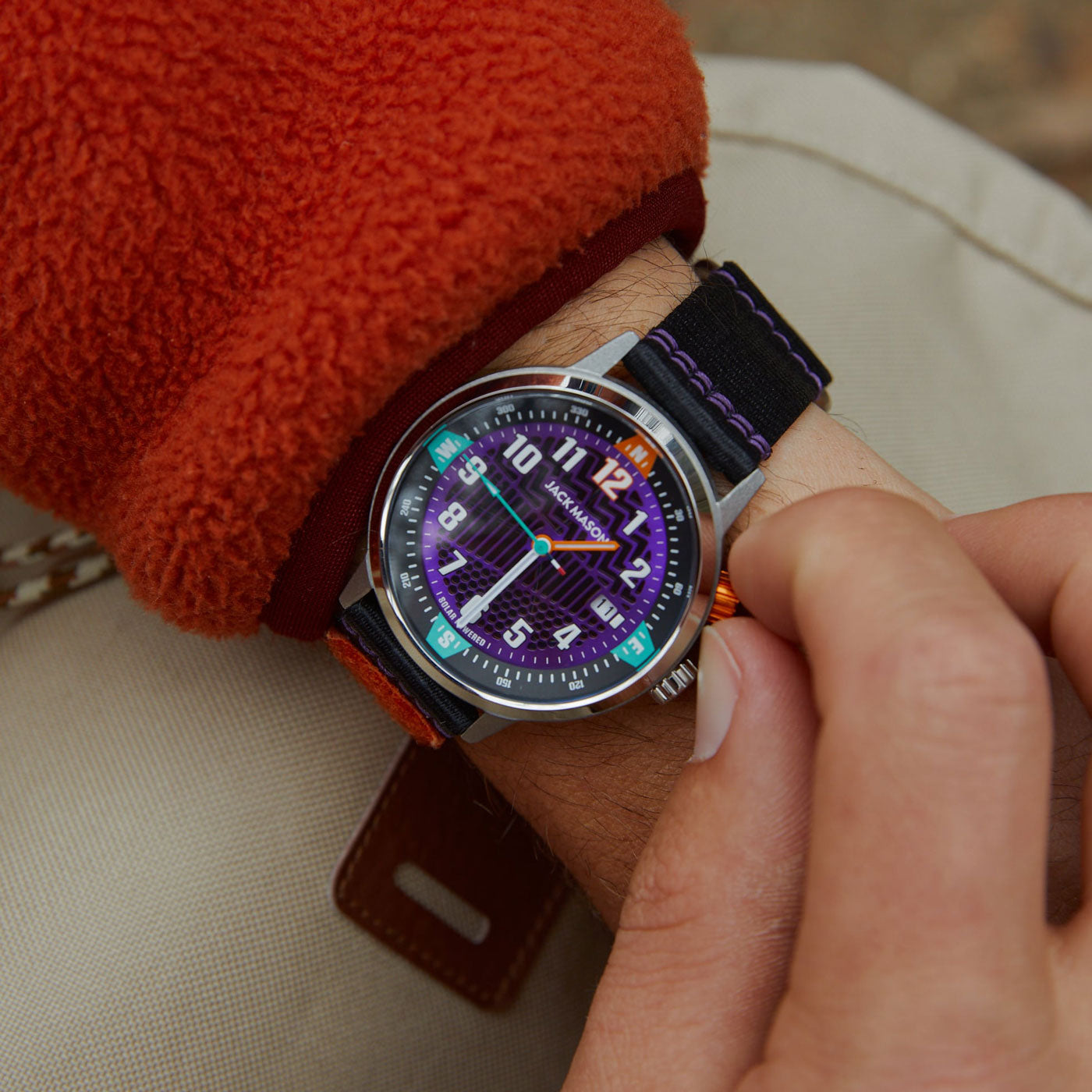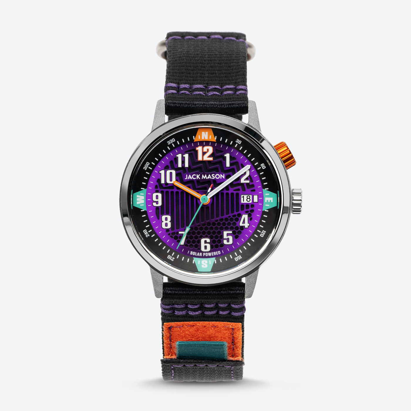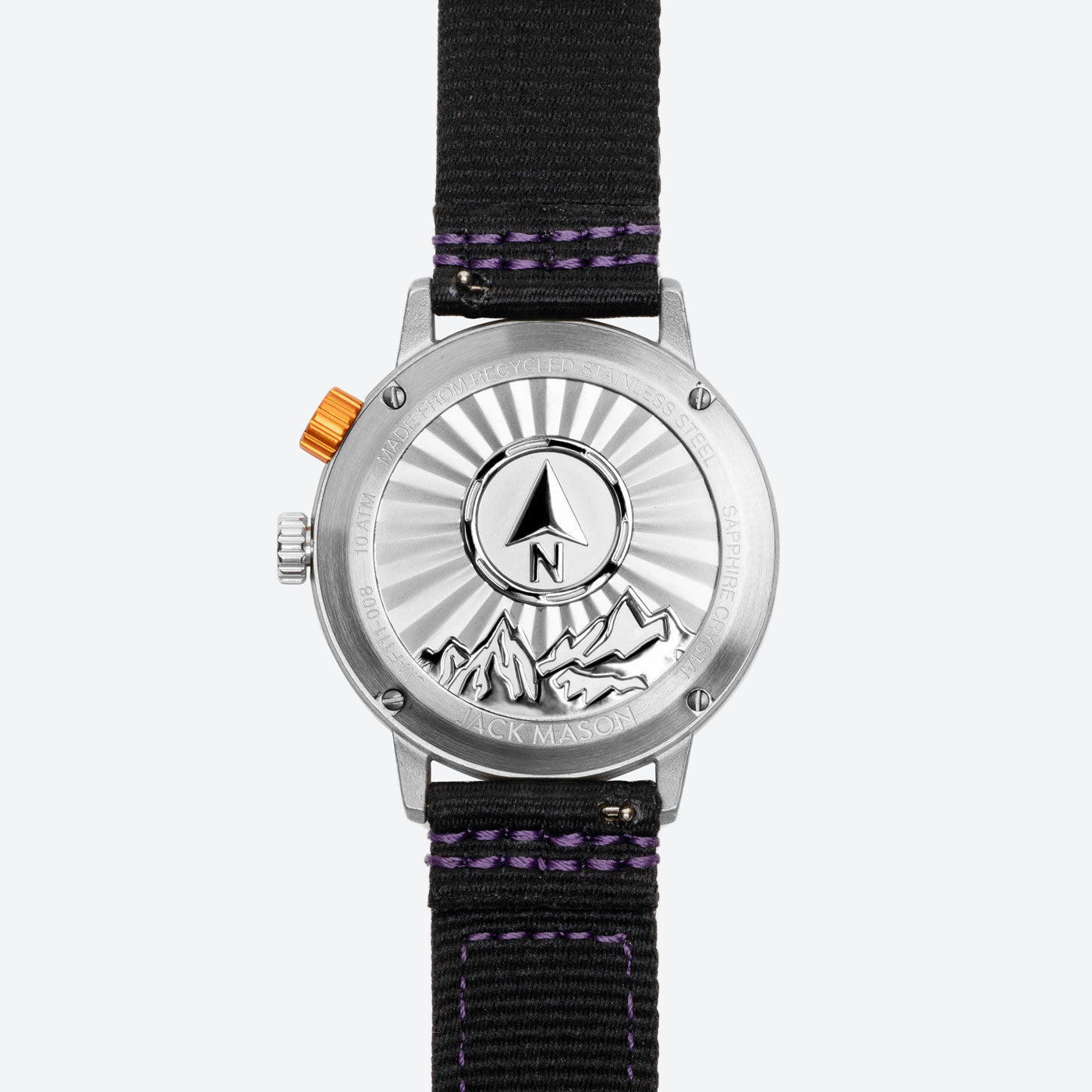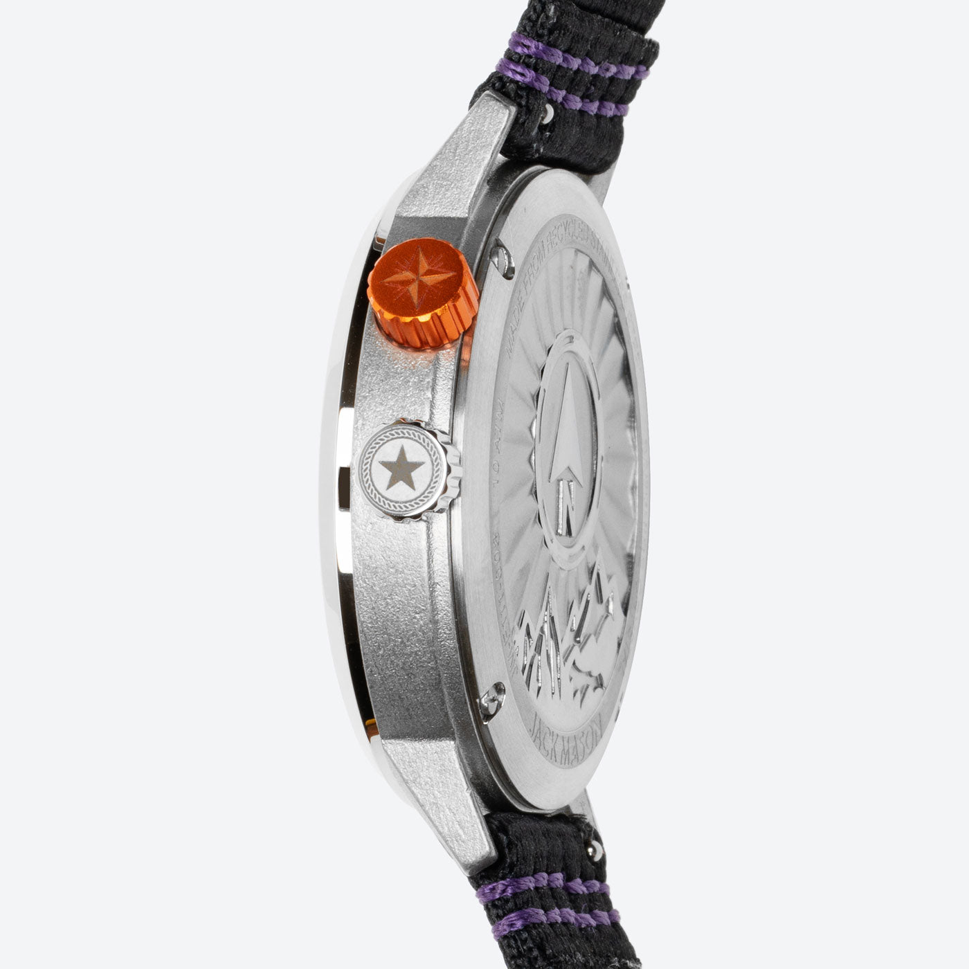 The Solar watch is back for Earth Day and bolder than ever. It features a cast recycled stainless steel case that is assembled and tested for water- resistance of up to 100 meters. The solar-powered movement sits below the purple perforated dial and can last up to 6 months on a full charge. The 20mm strap is made from recycled ocean plastic and features velcro for maximum adjustability. 10% of profits will be donated to the Jan & Oscar Foundation to help the continued efforts in cleaning up our oceans.