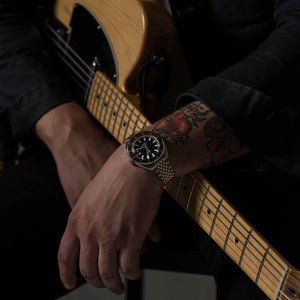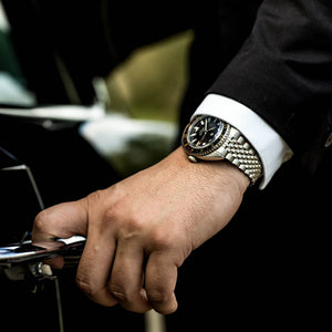 On-the-fly bracelet adjustment. The 7-row, 316L stainless steel bracelet has a comfortable 20mm to 16mm taper and is equipped with solid, quick-release end links. The micro-adjust buckle seals the deal and ensures a great fit on wrists of all sizes.