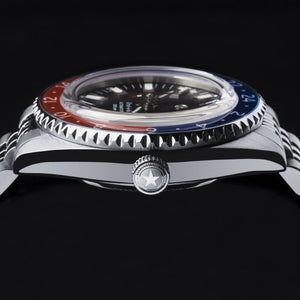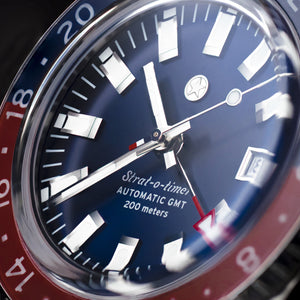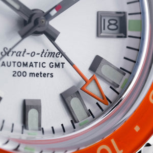 Housing the all new and limited Miyota Caliber 9075 movement, the Strat-o-timer features an automatic GMT movement with jump hour functionality. Other features include a boxed sapphire crystal, 200m WR, and a bi-directional bezel with multi-colored SuperLuminova. This entire package is designed, assembled, and regulated in the USA.