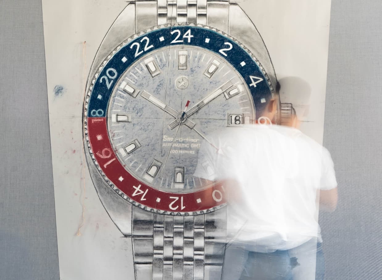 Original 7 Foot Concept Sketch. A big idea takes center stage as designer Peter Cho creates a massive 84” concept sketch of the Strat-o-timer GMT. Now on display at our studio in Dallas, the original concept sketch will be available as a digital print for the first 500 pre-orders.