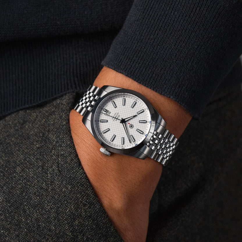 The 316L stainless steel bracelet features a concealed, tool-free system for on-the-go micro-adjustments. The clasp has been carefully engineered with 9 levels of fine-tuning to ensure the perfect fit on a broad spectrum of wrist sizes. While being worn, all the clasp’s mechanics stay hidden out of view to preserve the bracelet’s refined and uniform look.
