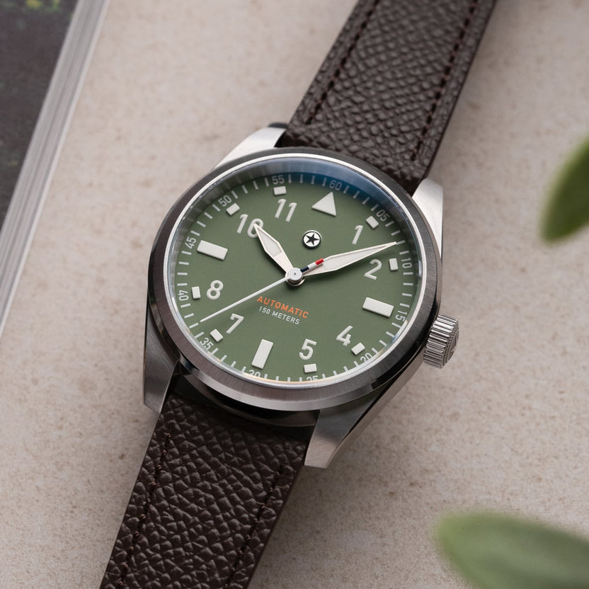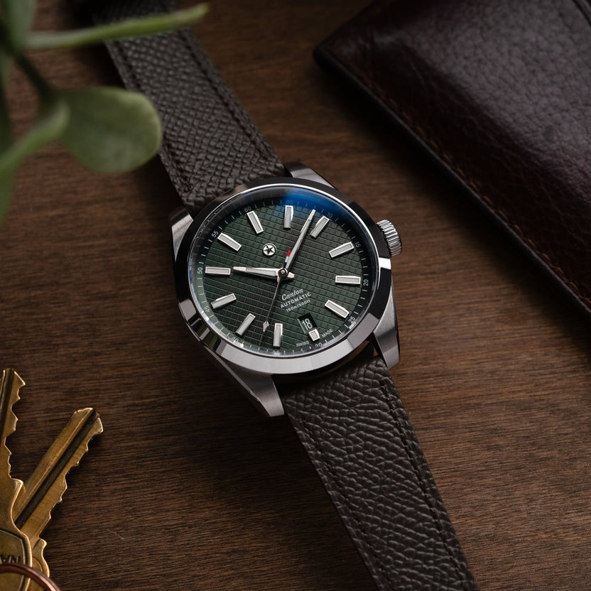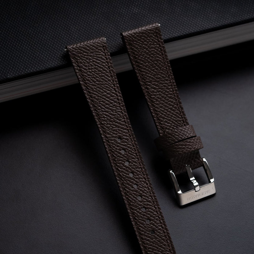 Leather straps are an excellent way in enhancing the look of your watch to match your own unique style. Utilizing Epsom leather from European tanneries ensures the quality is on par with the most high end luxury leather goods. The flat construction with a soft filler guarantees no break in period and makes it easy to wear out of the box. With considered stitch length and gauge combined with a refined heat crease along the perimeter, every detail has been thought through. Jack Mason straps feature an alcantara lining which acts as a natural moisture wicking material and feels great against the skin. The straps taper from 20mm to 16mm.