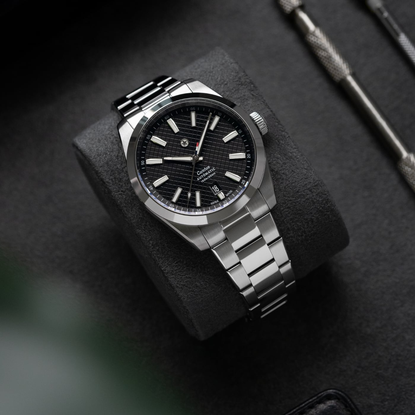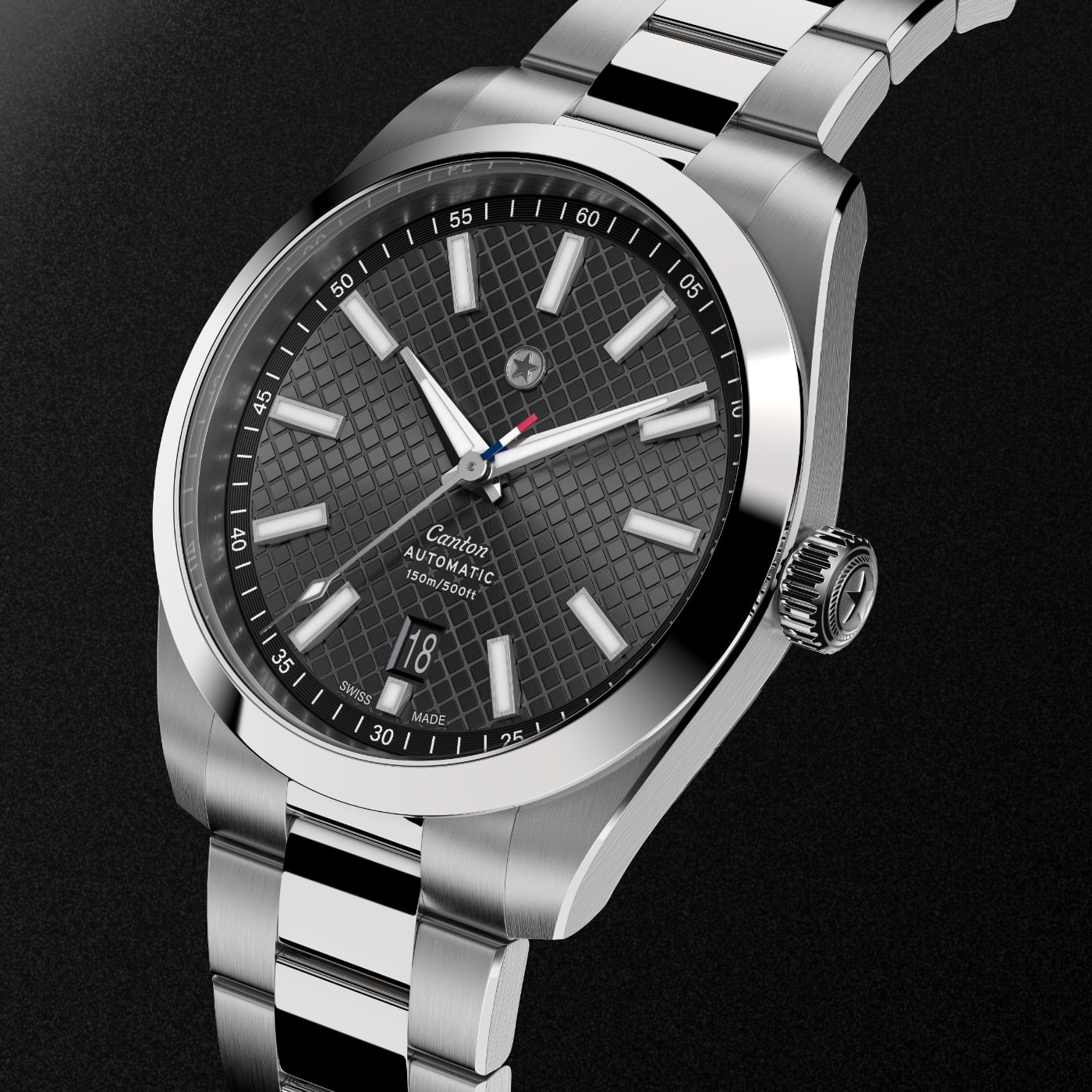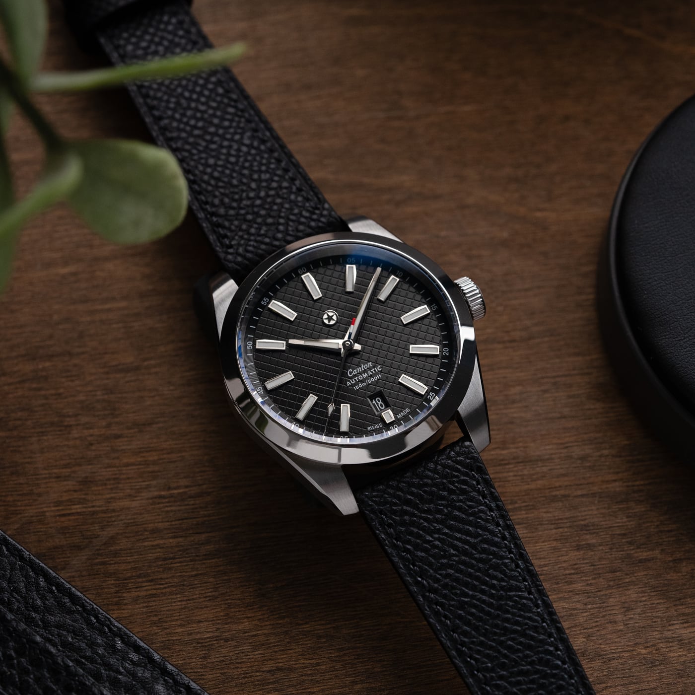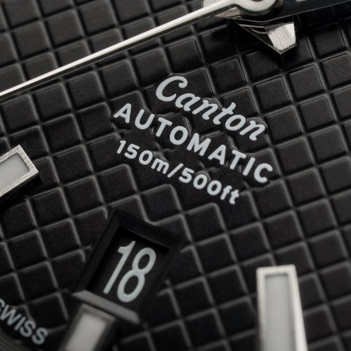The Canton was designed to be the perfect everyday watch. Featuring a La Joux Perret G100 movement that boasts 68 hours of power reserve, the Canton is packed with performance features a daily commuter would need in any environment. The case measures 39mm in width and 46mm lug to lug, making it the absolute perfect size for any wrist. The Canton features a unique waffle textured dial with a beautiful sunray finish to add depth and visual interest. The Anthracite dial is black in most occasions, but can appear a rich dark charcoal grey in other lighting conditions. To meet the needs of the daily grind, a scratch resistant coating has been added to the bracelet in addition to a micro-adjusting bracelet clasp.