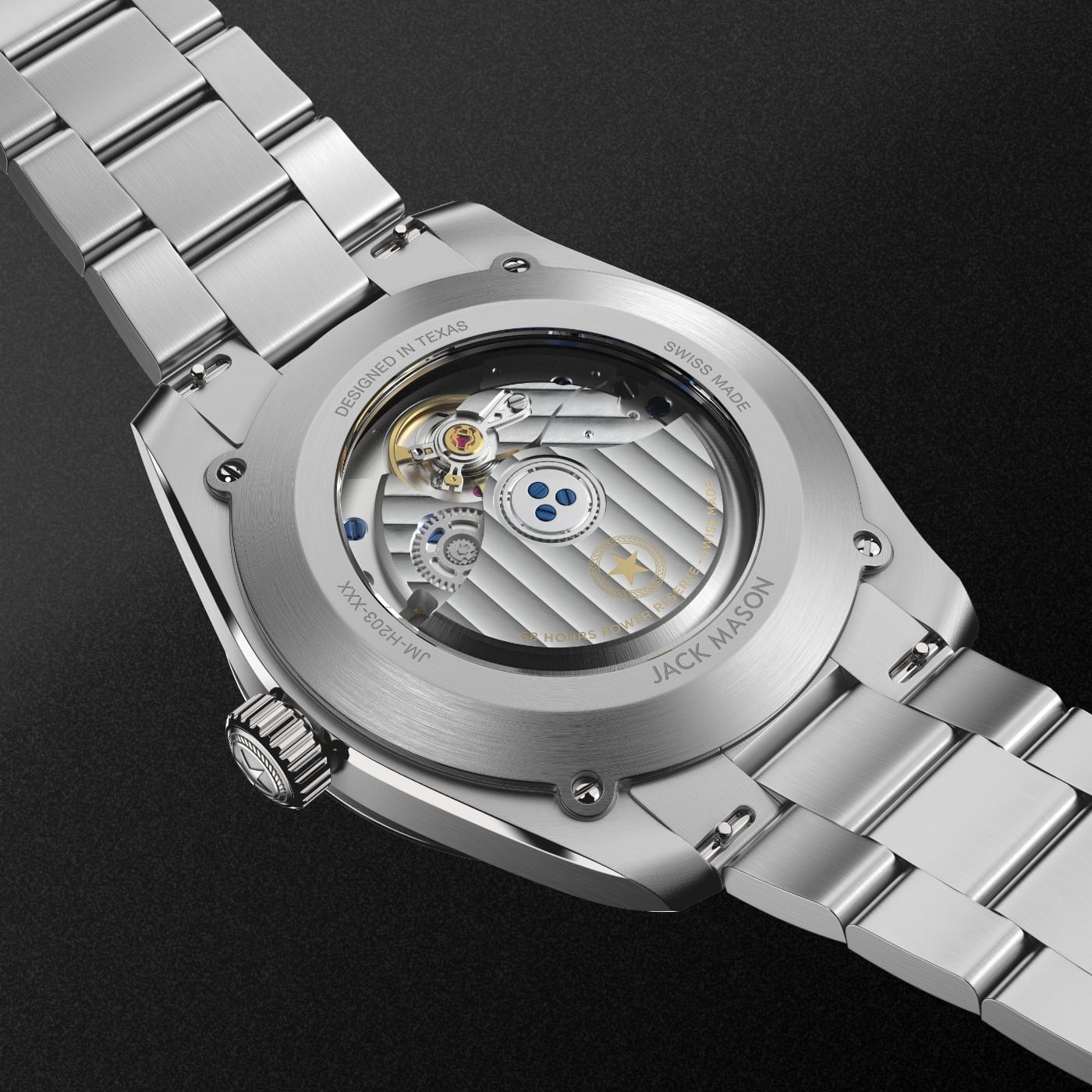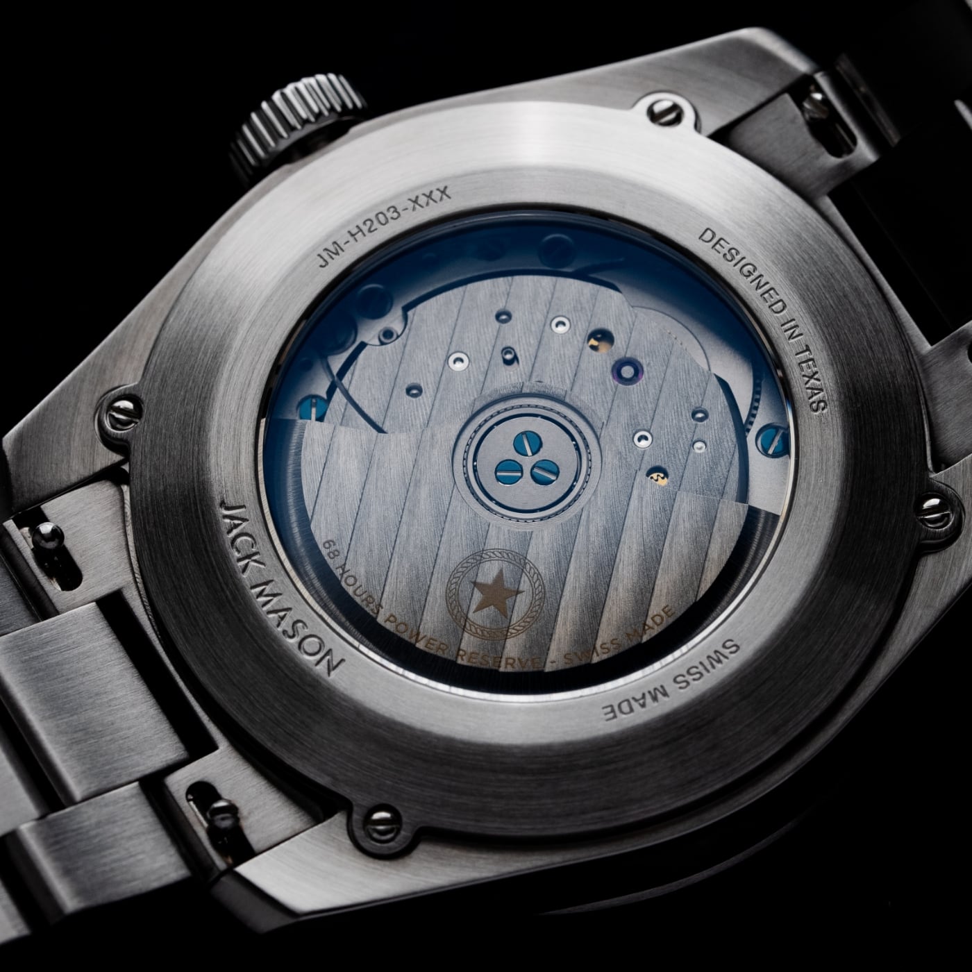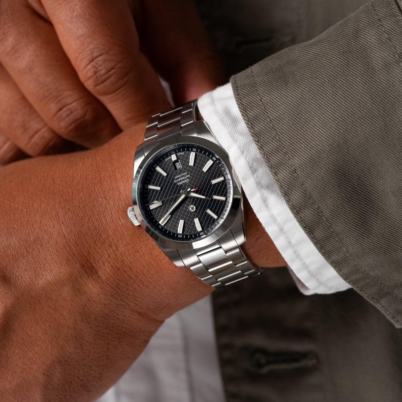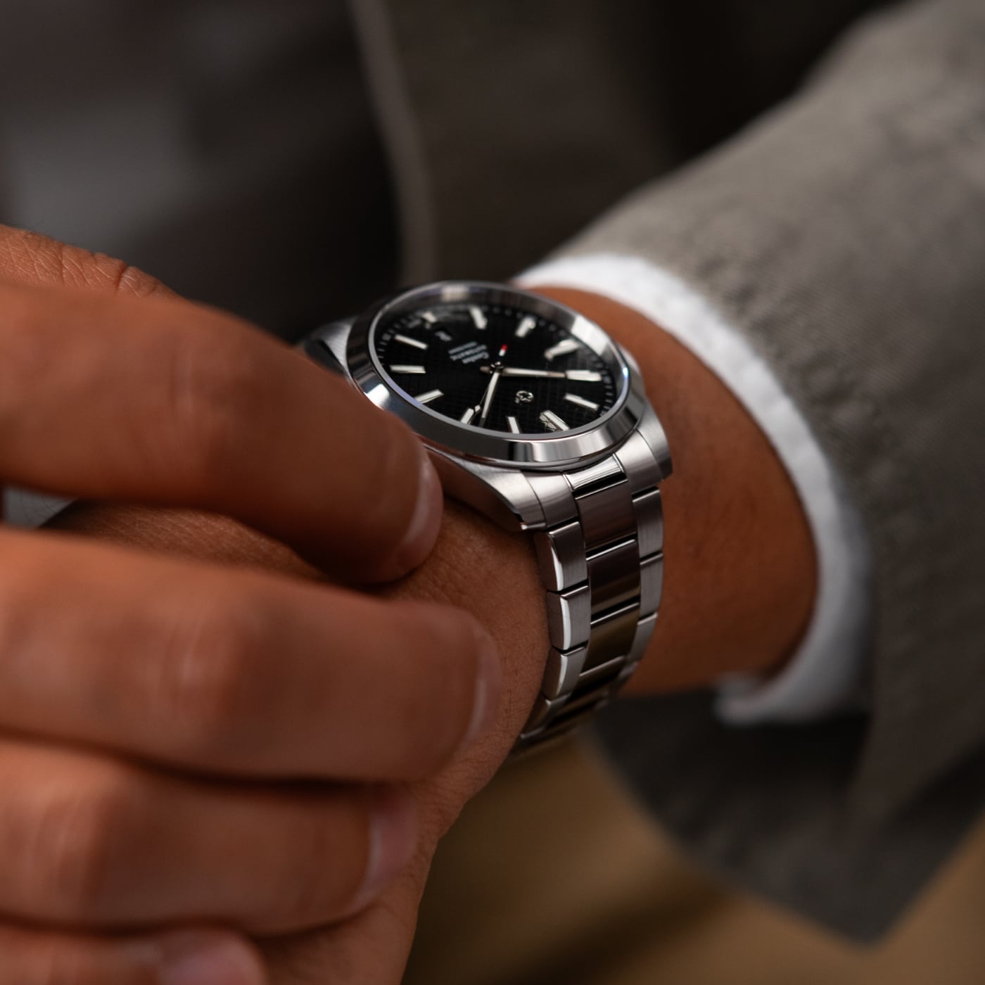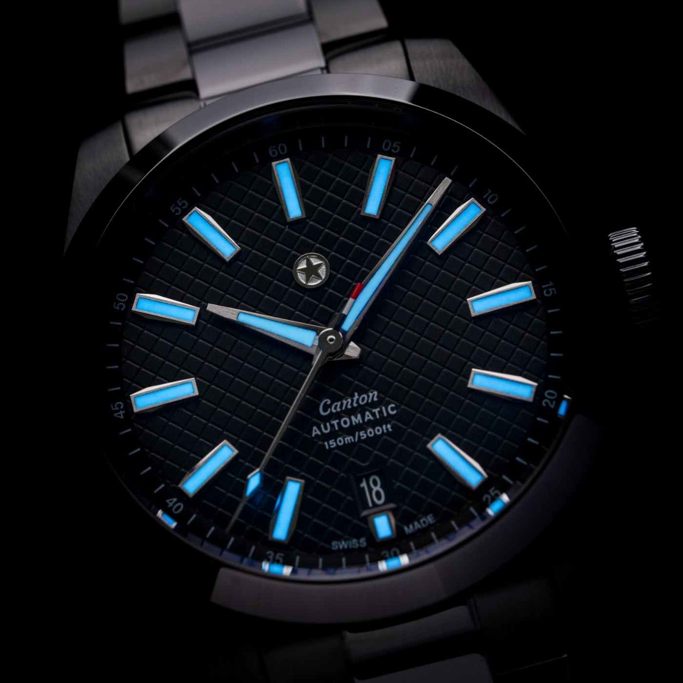 The Canton was designed to be the perfect everyday watch. Featuring a La Joux Perret G100 movement that boasts 68 hours of power reserve, the Canton is packed with performance features a daily commuter would need in any environment. The case measures 39mm in width and 46mm lug to lug, making it the absolute perfect size for any wrist. The Canton features a unique waffle textured dial with a beautiful sunray finish to add depth and visual interest. The Anthracite dial is black in most occasions, but can appear a rich dark charcoal grey in other lighting conditions. To meet the needs of the daily grind, a scratch resistant coating has been added to the bracelet in addition to a micro-adjusting bracelet clasp.