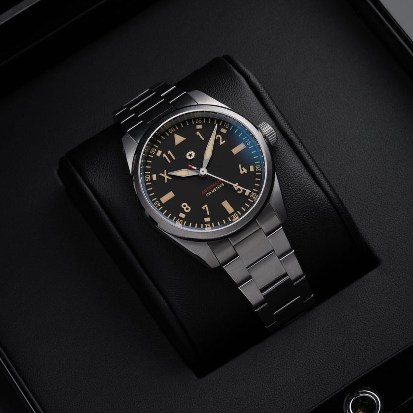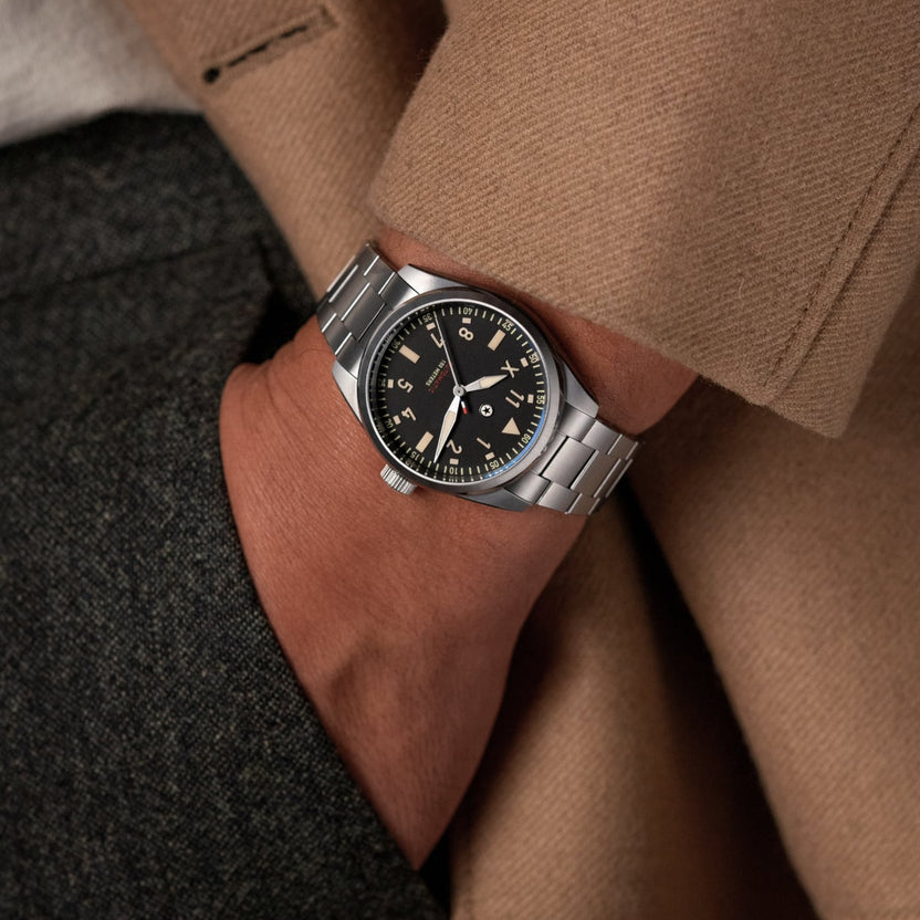 For the first time in ten years, the 2025 Pursuit Pilot has been completely redesigned and reissued to honor the first watch that was designed to launch Jack Mason watches. This Anniversary Edition is limited to production in 2025 only. The new Pursuit Pilot is produced at the highest level, where finishing and hand feel are leading indicators of build quality. The case and bracelet is made of Grade 2 titanium with a hardness coating to protect daily wear and tear. The ultra fine brushing and crisp transitions to polished surfaces are details that exude luxury grade finishing. This flat black dial has a matte finish and the legibility is great enhanced by solid forms of Lumicast® made with SuperLumiNova Grade X2 which boasts up to 87% performance enhancement over Grade X1. This anniversary edition also features an "X" at the ten o'clock position to indicate this momentous occasion. Inside, the Pursuit Pilot is powered by a Swiss Made La Joux Perret G101 movement that is regulated in-house to +/-5 seconds per day, which is further protected by an anti-magnetic cage to maintain accuracy. This is the perfect robust tool watch. The Pursuit Pilot is proudly built in the USA.