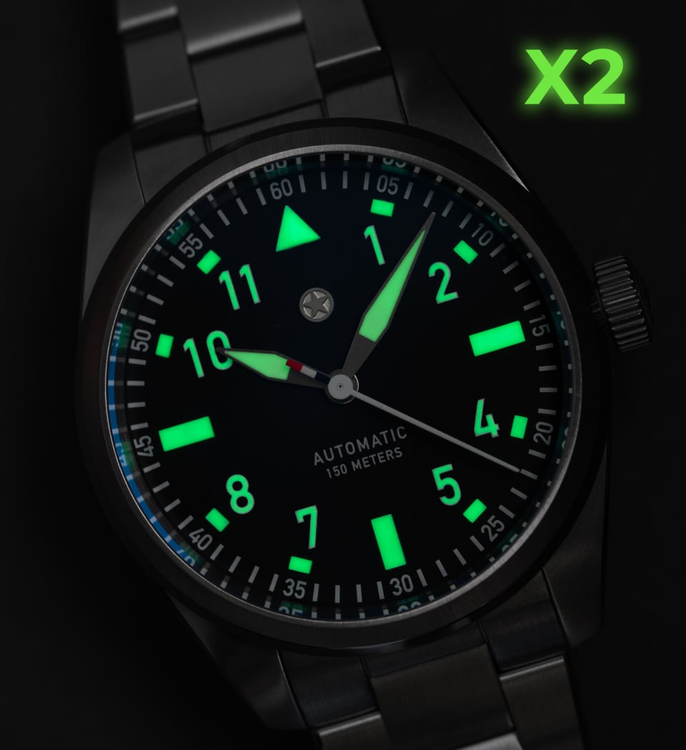 For a brighter, longer lasting glow, the Pursuit Pilot features the newest generation of Super-LumiNova® – Grade X2. Compared to the previous generation, X2 impresses with a performance increase of up to 87% over 60 minutes. Additionally, the extremely legible Lumicast® hour markers along the perimeter of the dial are molded from the material. This all results in a handset, hour markers, and numerals that all glow brighter, for longer.