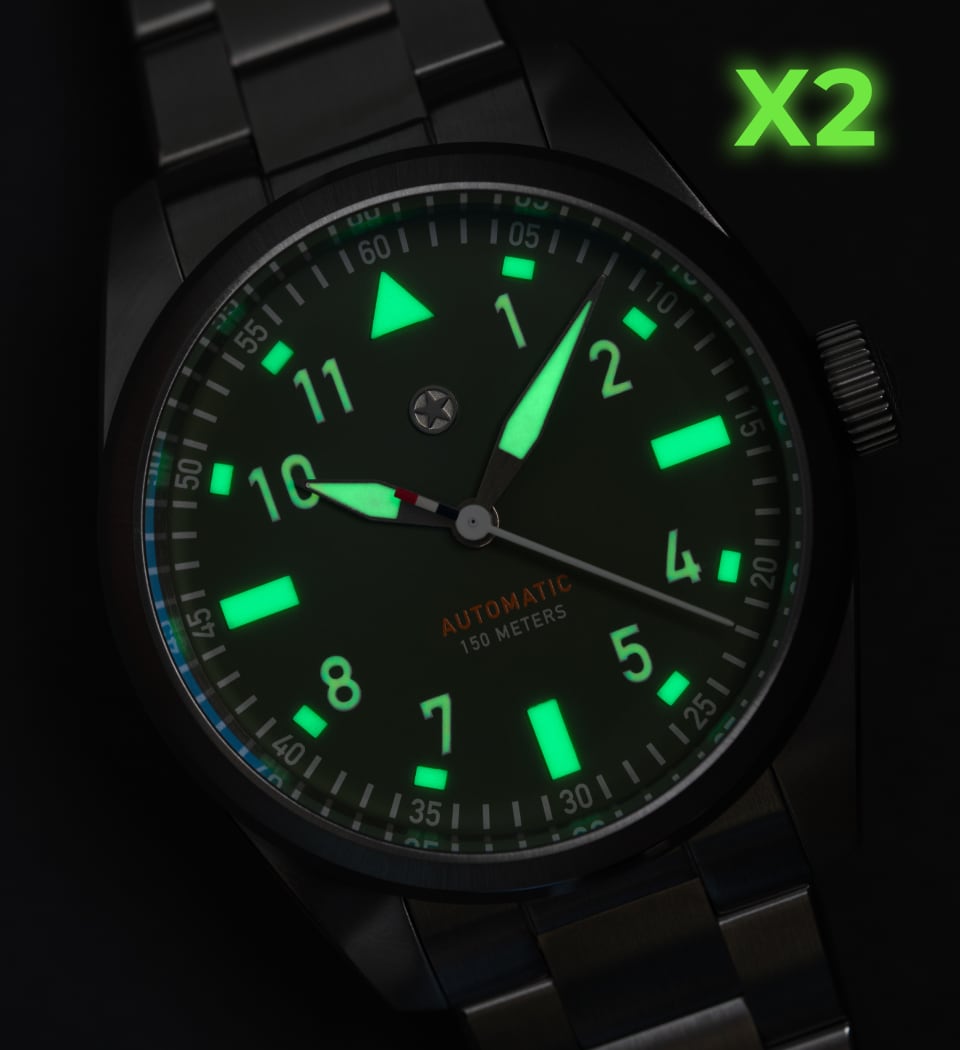 For a brighter, longer lasting glow, the Pursuit Pilot features the newest generation of Super-LumiNova® – Grade X2. Compared to the previous generation, X2 impresses with a performance increase of up to 87% over 60 minutes. Additionally, the extremely legible Lumicast® hour markers along the perimeter of the dial are molded from the material. This all results in a handset, hour markers, and numerals that all glow brighter, for longer.