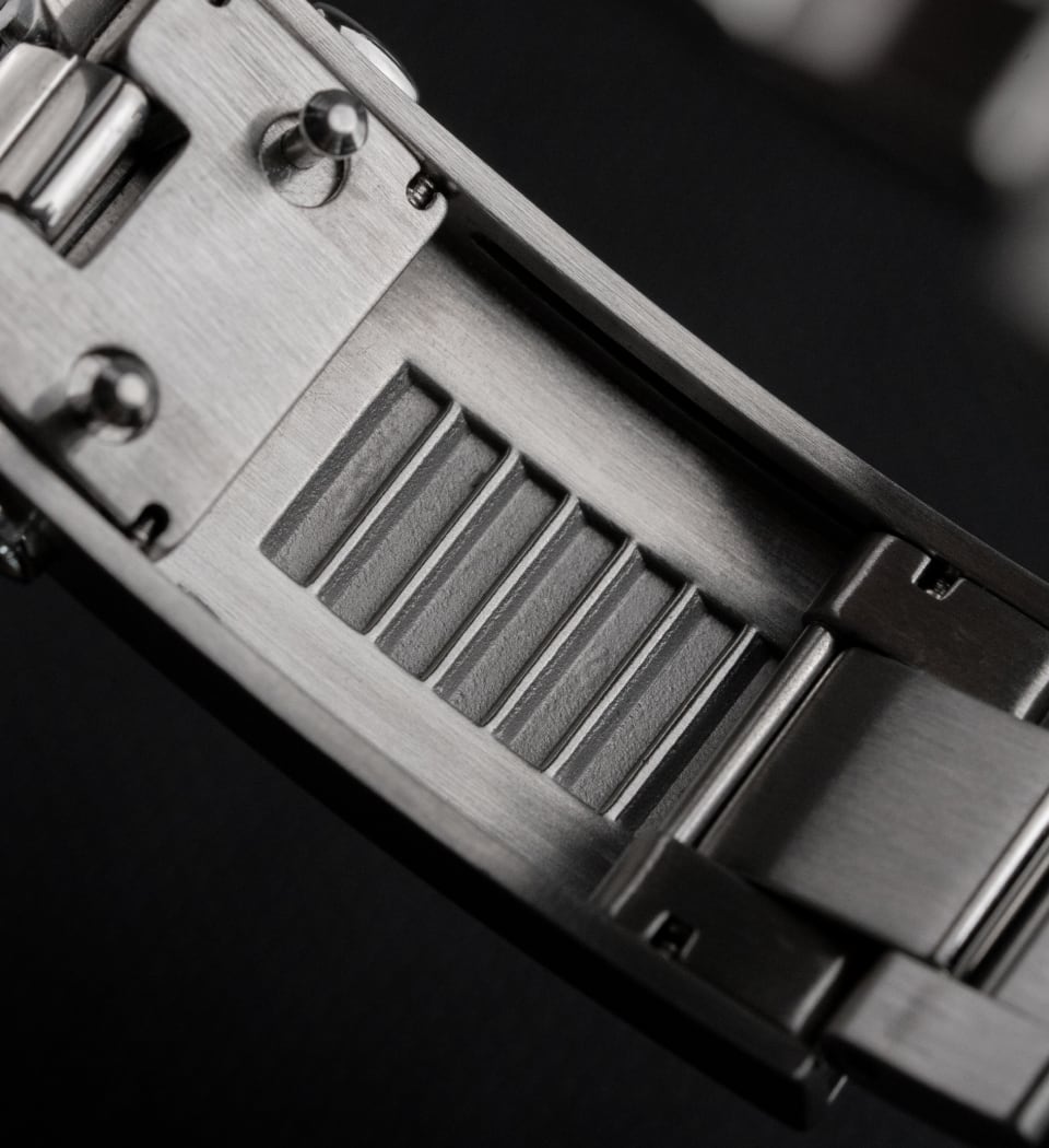 The Pursuit Pilot’s bracelet features a concealed, tool-free system for on-the-go micro-adjustments. The clasp has been carefully engineered with 9 levels of fine-tuning to ensure the perfect fit on a broad spectrum of wrist sizes. While being worn, all the clasp’s mechanics stay hidden out of view to preserve the bracelet’s refined and uniform look.