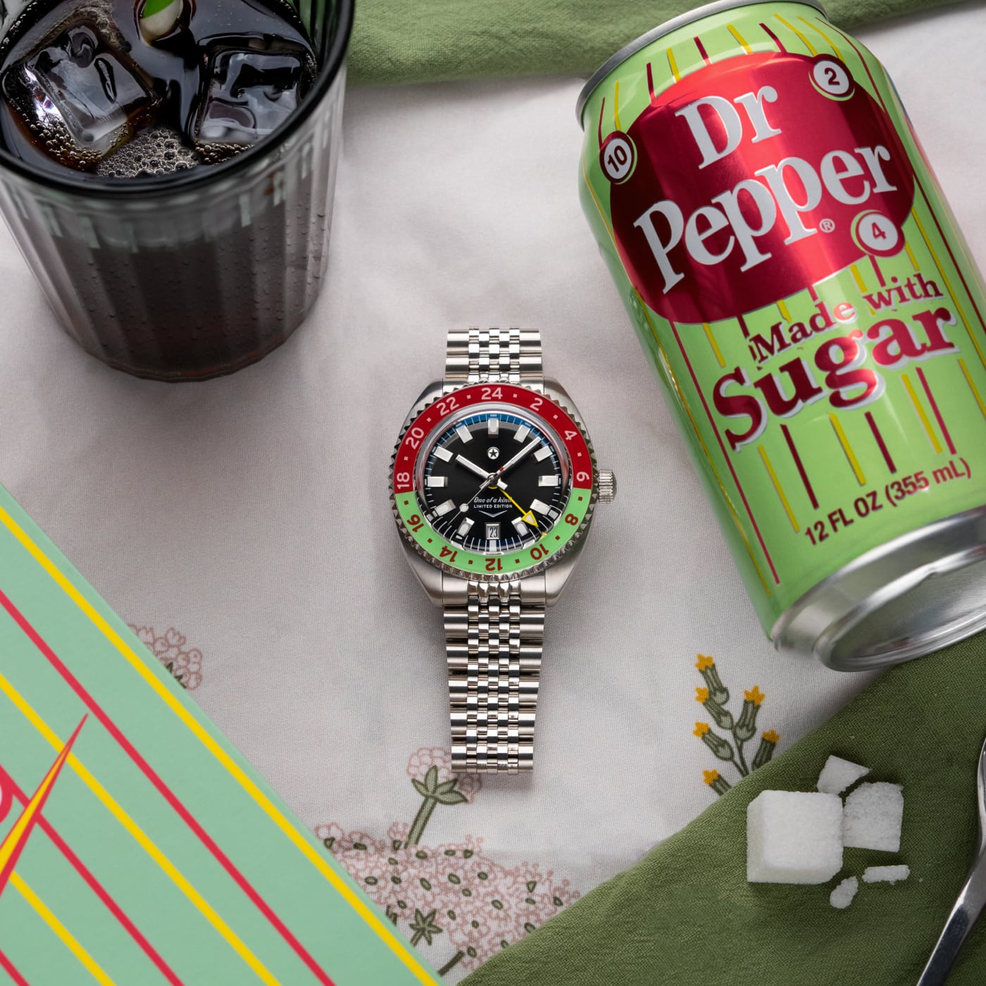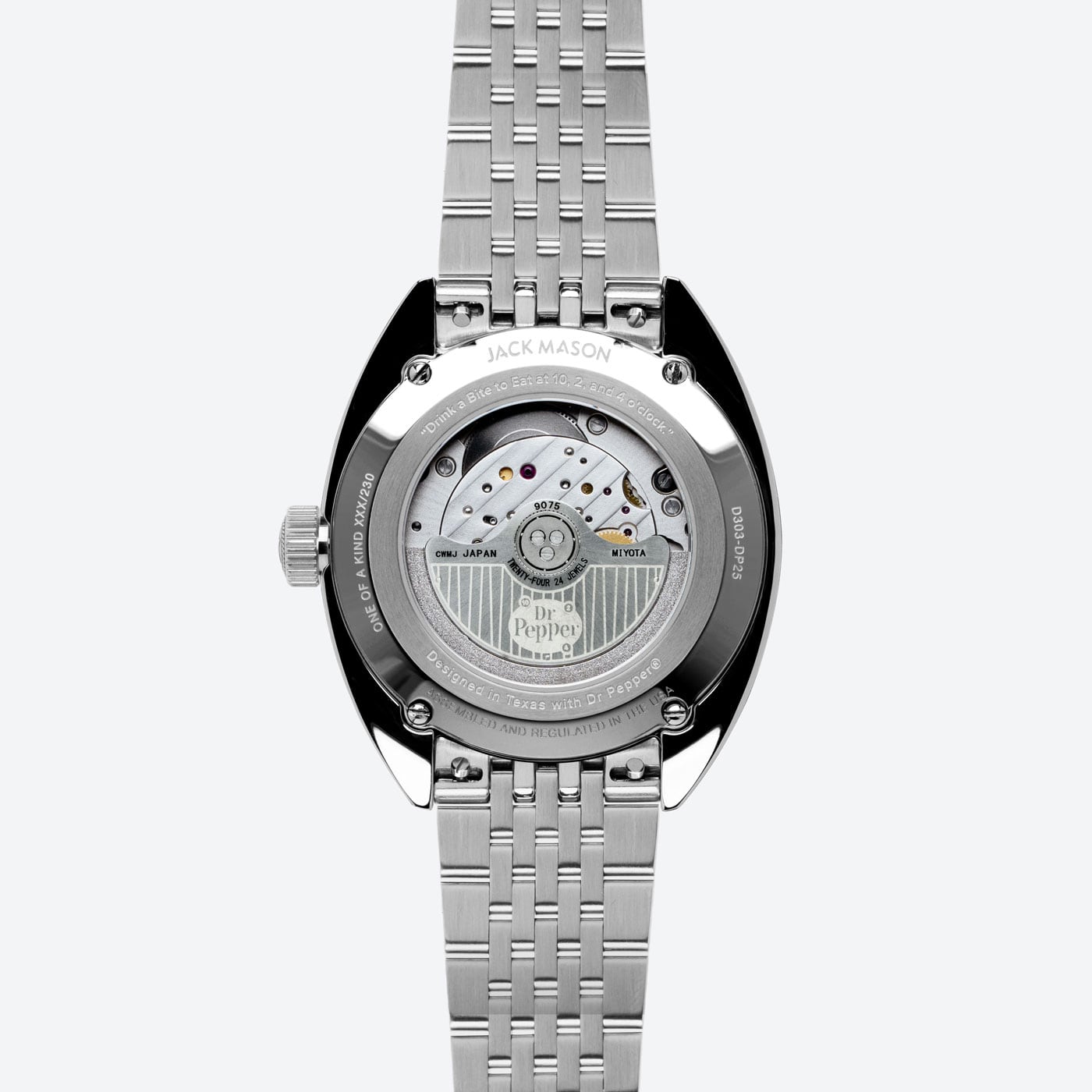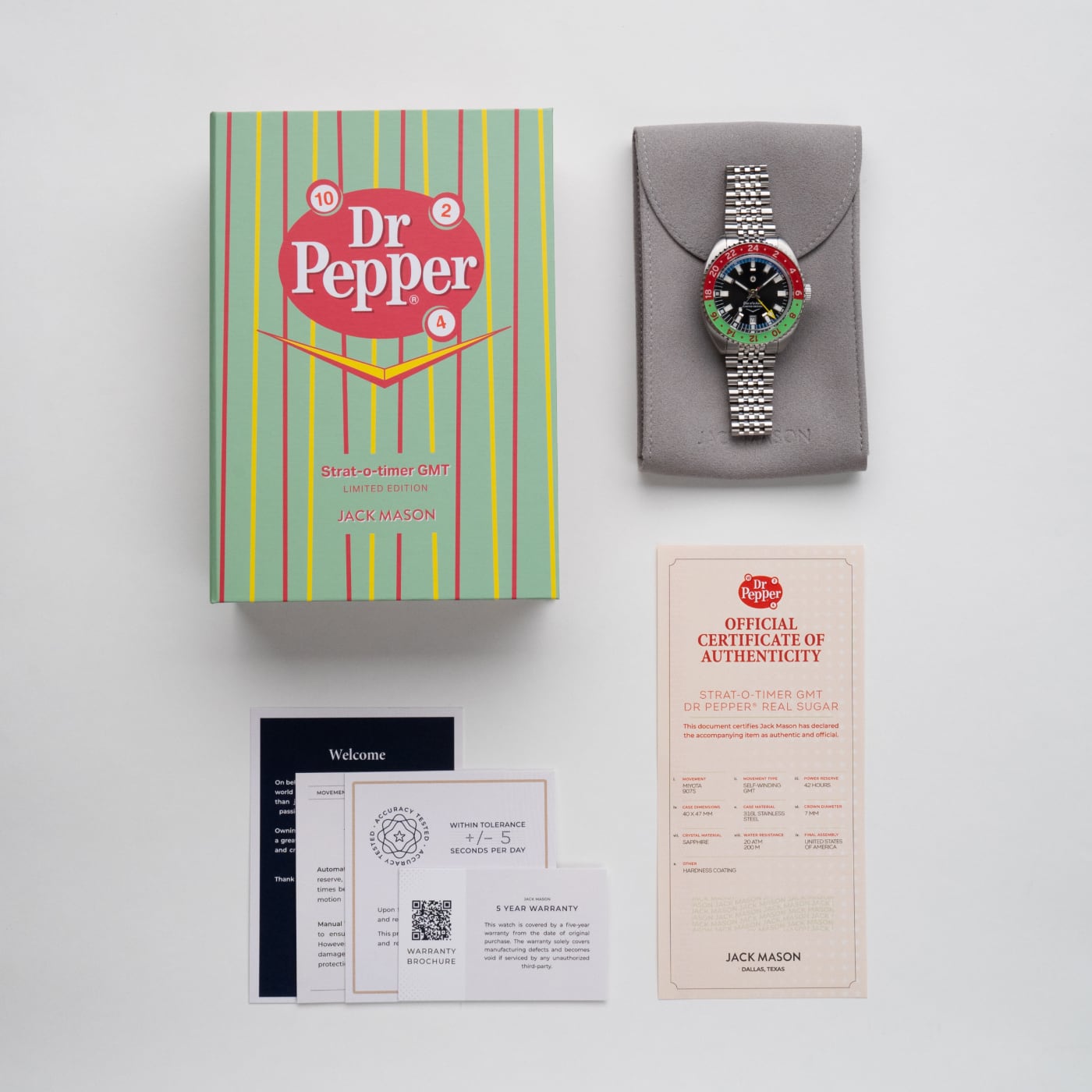 The Dr Pepper® Strat-o-timer is back for the 2025 edition of this unique collaboration. Inspired by the Made with Sugar branding, the color scheme features a unique lime green and red colorway on the bezel making this piece unique. This partnership between Jack Mason and Dr Pepper® symbolizes two Texas brands that came together and shared a common passion for the lifestyle of treating yourself to something special. This piece is limited to 230 units.