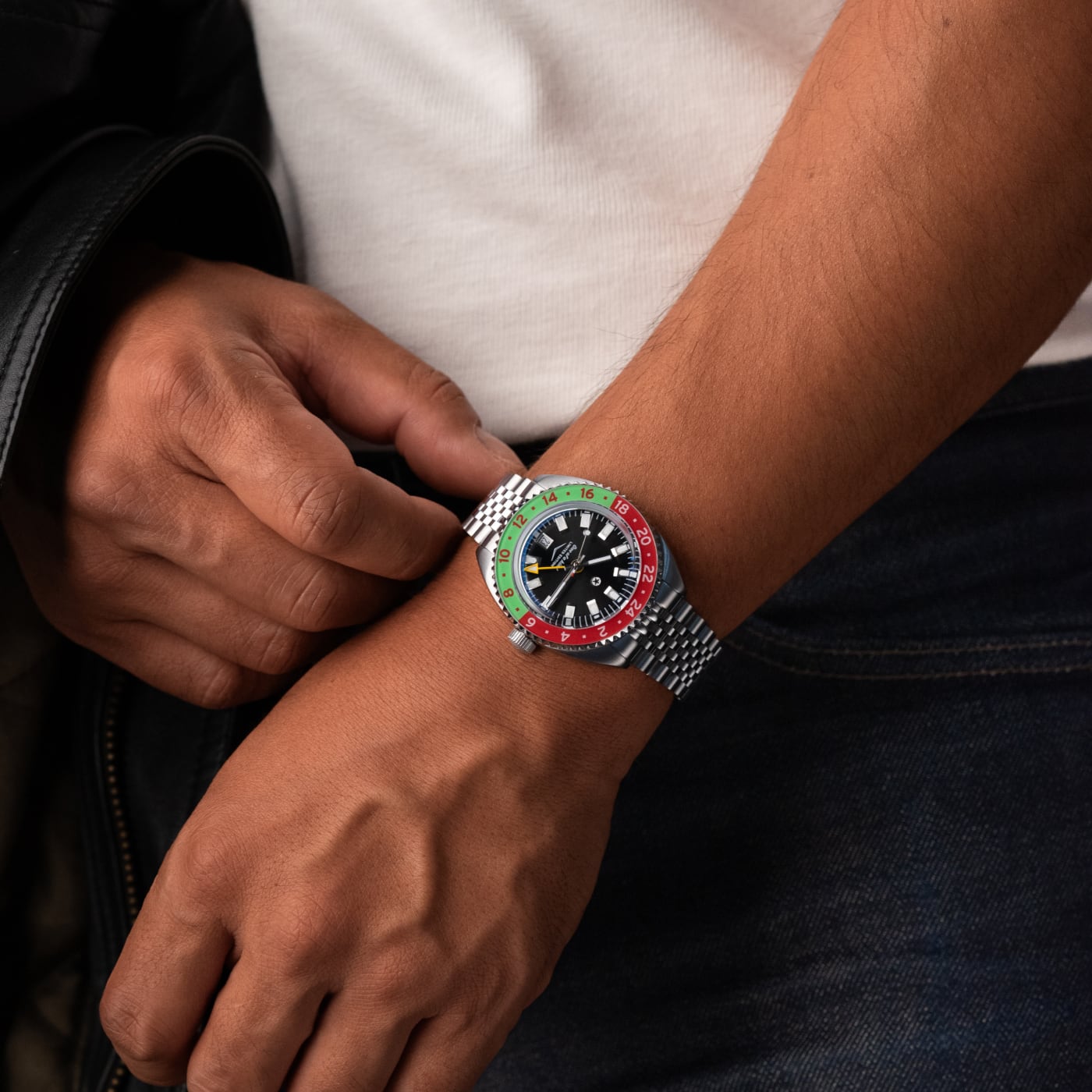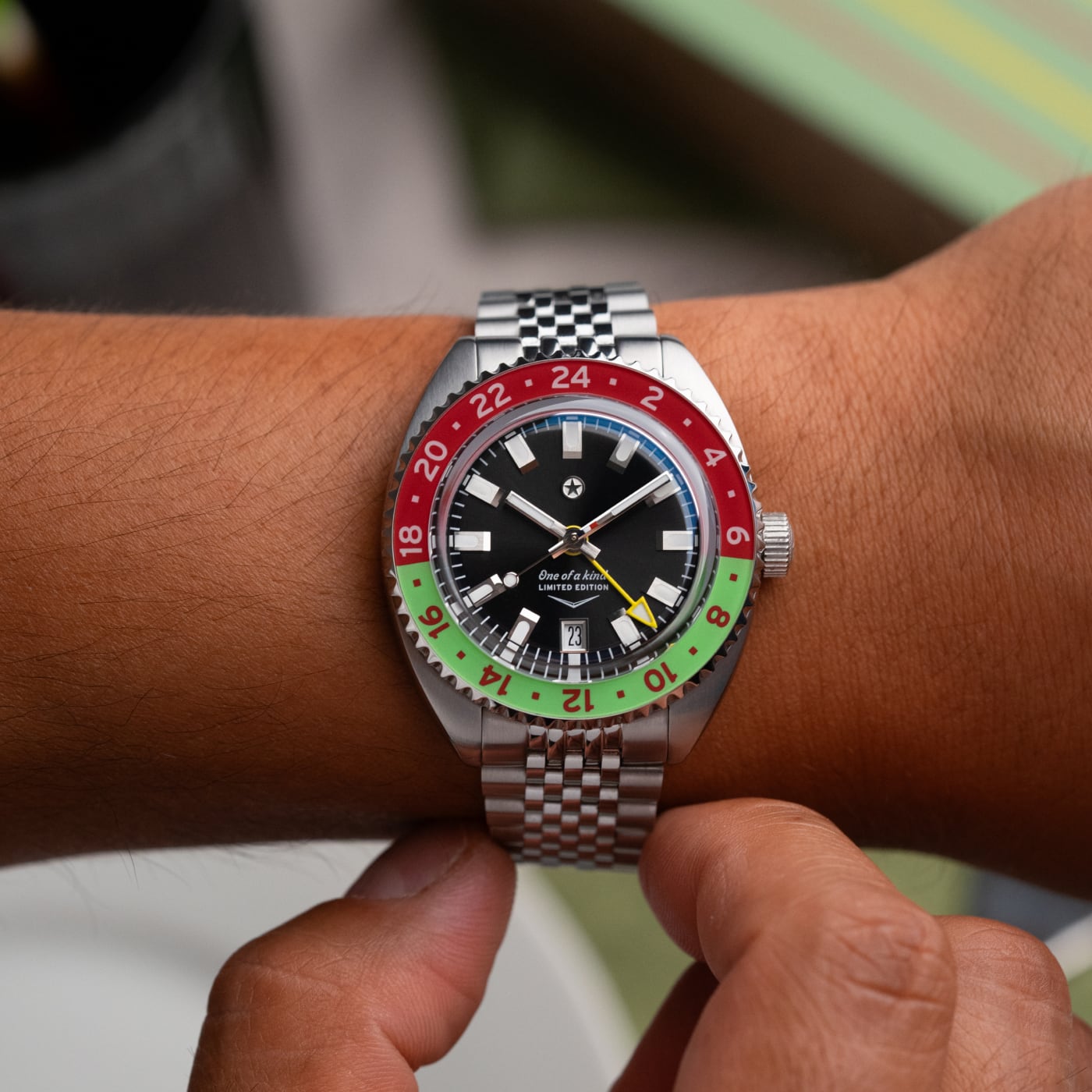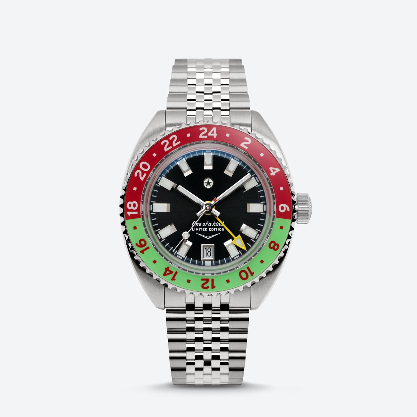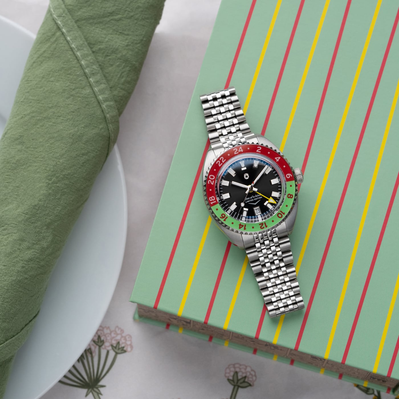 The Dr Pepper® Strat-o-timer is back for the 2025 edition of this unique collaboration. Inspired by the Made with Sugar branding, the color scheme features a unique lime green and red colorway on the bezel making this piece unique. This partnership between Jack Mason and Dr Pepper® symbolizes two Texas brands that came together and shared a common passion for the lifestyle of treating yourself to something special. This piece is limited to 230 units.
