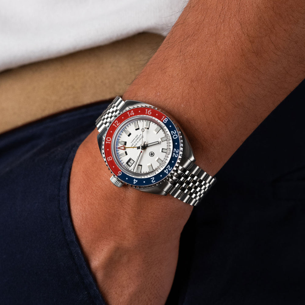 This limited edition Strat-o-timer celebrates Team USA. Housing the Miyota 9075 automatic GMT movement, the Strat-o-timer marks the beginning of a new era of GMTs that features a jumping local hour hand. The bezel features a sapphire insert with Superluminova markings. With a vision of becoming a legacy brand in our home state of Texas, the Strat-o-timer is assembled, and the movement regulated, in the USA.