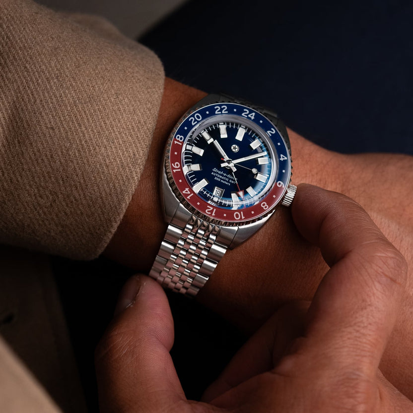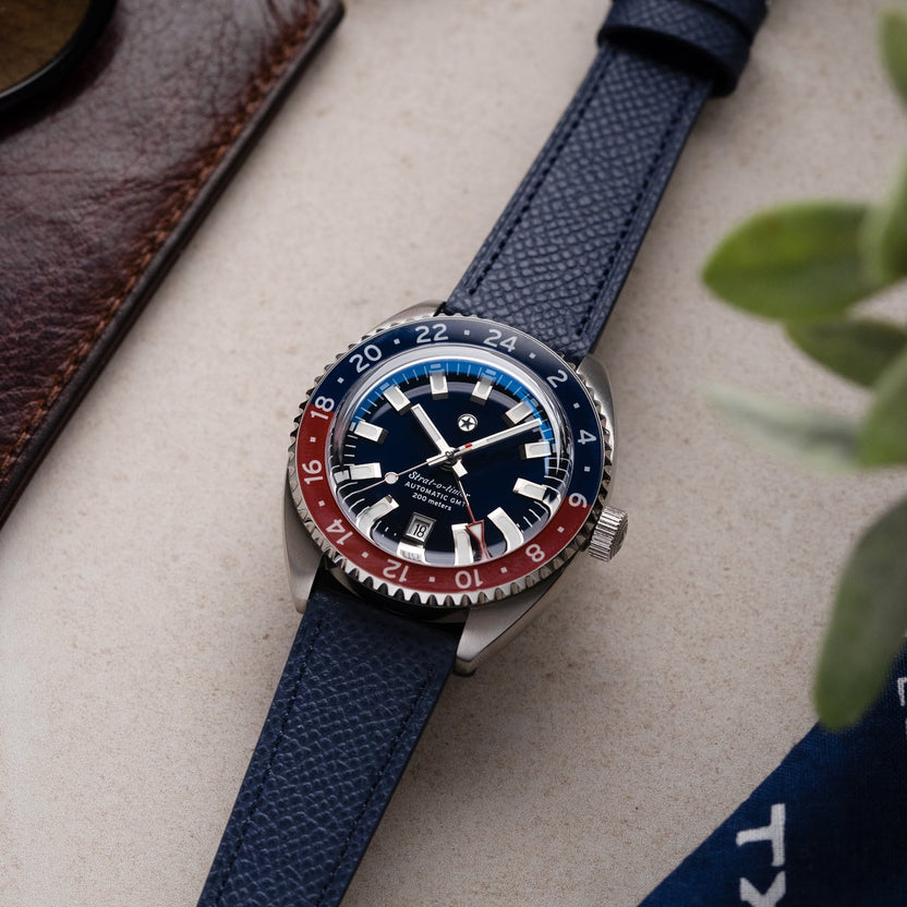 The mechanical, self-winding Miyota 9075 movement allows for accurately tracking two different timezones simultaneously. The traveler GMT functionality grants the ability to adjust the local time via the crown without affecting the 24 hour hand or stopping the watch. Every movement is regulated in-house to maintain an accuracy tolerance of +/-5 seconds per day.