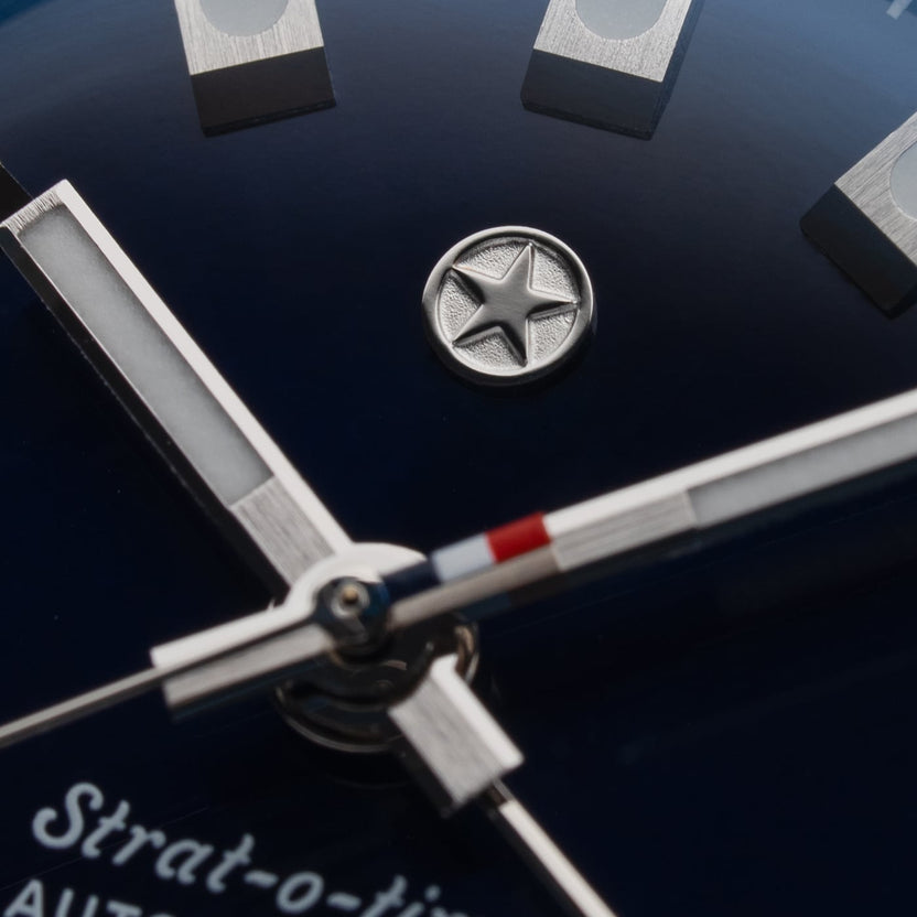 The iconic Strat-o-timer cushion case was intentionally designed to be versatile across a variety of wrist sizes. The top side of the case features a brushed finish, while the sides have been mirror polished to accentuate the subtle curvature of the case. Each of these surfaces meet at an elegantly defined edge that emphasizes the case architecture. As an added benefit, the case has been treated with a scratch-resistant coating that protects the watch from minor wear and tear.